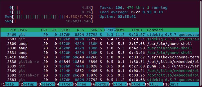 Htop is a powerful system monitor that’s primarily used for checking resource usage stats. It can provide info on the overall system state (CPU, RAM usage) as well as individual processes. It’s a useful tool for figuring out which programs or processes are occupying how much of your system resources. Aside from viewing the stats, it can also be used to find and kill processes. Installing Htop on Ubuntu Htop is pretty similar to the top utility, except that top is preinstalled in Ubuntu but not quite as flexible as htop. Htop is typically installed using apt, but if you need the latest version, you can install it using snap instead. Ultimately, both versions work fine. sudo apt install htop sudo snap install htop After installing htop, you can launch it by entering htop Interpreting Htop’s Output At first glance, Htop’s output can seem a bit overwhelming but it’s actually pretty simple to understand. At the top, you have all the CPU cores and threads with color-coded bars and usage percentages. Green: User processes Red: Kernel processes Aqua blue: Virtualized processes Blue: Low-priority threads Next is the memory and swap space info with color-coded bars again. Green: Memory used by system processes Blue: Buffer pages Orange: Cache pages Finally, there are the remaining miscellaneous stats. Tasks: Total ongoing processes thr: Total threads handling the processes running: tasks in a state of running Load average: Average system load over a period of time (last minute, 4 minutes, 15 minutes) Uptime: System uptime In the lower half, there are 12 columns by default. You can add additional columns or remove existing ones through the setup tool (F2), but let’s just go over the standard ones for now. PID: Process ID USER: Process owner PRI: The kernel-space priority of the process. It’s usually calculated as NI + 20 and a lower value means higher priority. NI: The nice value of the process. It can range from 19 to -20 with a lower value indicating higher priority. VIRT: The virtual size of the process. This sum total includes the same memory shared between libraries multiple times, so the value tends to be quite large. RES: The resident set size, i.e. how much physical memory the process is actually consuming. SHR: The amount of VIRT that is actually sharable. S: The state of the process (Sleeping-S, Running-R, Disk Sleep-D, Zombie-Z, Traced/Suspended-T, Paging-W) CPU%: The process’s CPU utilization. MEM%: The process’s memory utilization. TIME+: Process uptime. Command: Full path of the process. Htop Options and Shortcuts Now that you’re able to understand the output, let’s dive deeper into actually using htop. Filtering the Output The default output returns a ton of info. The best way to get exactly what you need out of this info is with the SortBy option. You can press F6 and select the metric to sort by (PID, PERCENT_MEM, etc.). If you want to search for processes using keywords, you can use Search (F3). For instance, if you enter discord, it’ll take you to the closest matching result. Pressing F3 again will cycle through the matches. If you only want the matching results to be shown, you can use Filter (F4) instead. Finally, you can press u to only view processes owned by a specific user. Killing a Process You can press F9 while a process is selected to kill it. In most cases, you should send the terminate signal (SIGTERM-15), which is highlighted by default. Other Htop Shortcuts The other shortcuts like F5 (tree view) or F2 (setup htop) aren’t as commonly used but feel free to check them out. Also, check the help page (F1) and manpage (man htop) if you want to read up further on htop.
